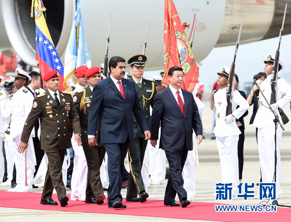 ??? 當?shù)貢r間7月20日,國家主席習近平抵達加拉加斯,開始對委內(nèi)瑞拉進行國事訪問。委內(nèi)瑞拉總統(tǒng)馬杜羅在機場為習近平舉行隆重歡迎儀式。新華社記者劉建生攝