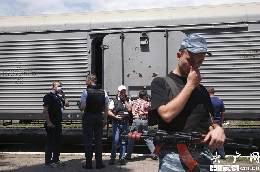 當(dāng)?shù)貢r(shí)間2014年7月20日,烏克蘭頓涅茨克Torez,馬航墜機(jī)遇難乘客遺體被裝上列車?yán)洳剀噹麑⒈贿\(yùn)走。載有部分遺體的火車從距空難現(xiàn)場(chǎng)不遠(yuǎn)的烏克蘭托列茲市出發(fā),前往頓涅茨克市?;疖囯x站前,身處空難現(xiàn)場(chǎng)的歐洲安全與合作組織(歐安組織)代表檢查了運(yùn)載遺體的5節(jié)冷藏車廂。