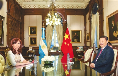 7月18日,國家主席習近平在布宜諾斯艾利斯同阿根廷總統(tǒng)克里斯蒂娜舉行會談,兩國元首就中阿關系及共同關心的問題深入交換意見,達成重要共識,一致決定將中阿關系提升為全面戰(zhàn)略伙伴關系,堅定把對方視為重要發(fā)展機遇和發(fā)展伙伴,加強互利合作和戰(zhàn)略協(xié)作,造福兩國和兩國人民,增強新興市場國家和發(fā)展中國家團結合作。