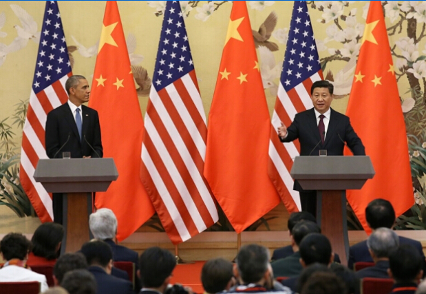 圖為11月12日,國家主席習近平在北京人民大會堂與來訪的美國總統(tǒng)奧巴馬舉行會談后,共同會見記者。