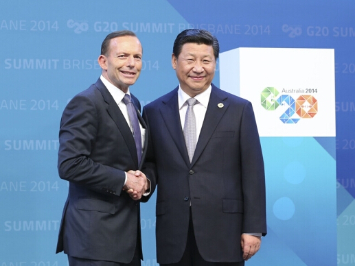 圖為11月15日,澳大利亞總理阿博特在布里斯班迎接習近平主席。