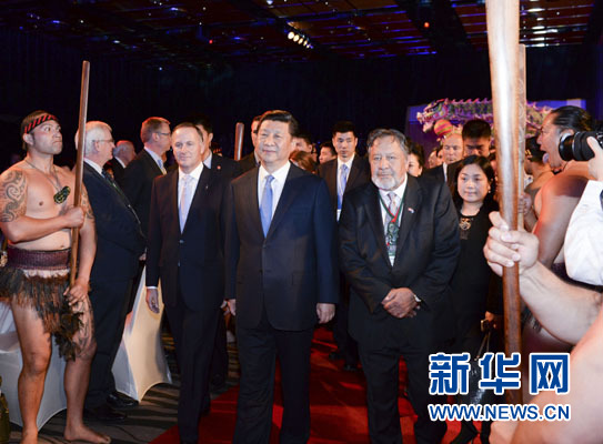 ????習近平和夫人彭麗媛抵達時,新西蘭總理約翰·基夫婦迎接,毛利族代表以傳統(tǒng)方式歡迎。在毛利族勇士和中國舞龍引領(lǐng)下,習近平和彭麗媛步入大廳,全場起立鼓掌。毛利族青年用歌聲表達喜悅和友誼。