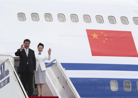 ??? 11月21日,國家主席習近平抵達楠迪。圖為習近平和夫人彭麗媛步出機艙。(攝影 丁林)