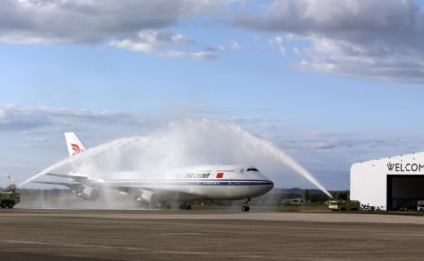 ????11月21日,習近平乘坐的專機在楠迪國際機場跑道上滑行穿過“水門”,這是當地給予最尊貴客人的禮遇,表達為客人“洗塵”。 (攝影 丁林)
