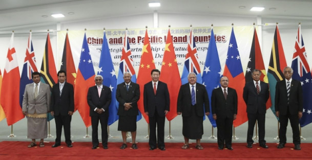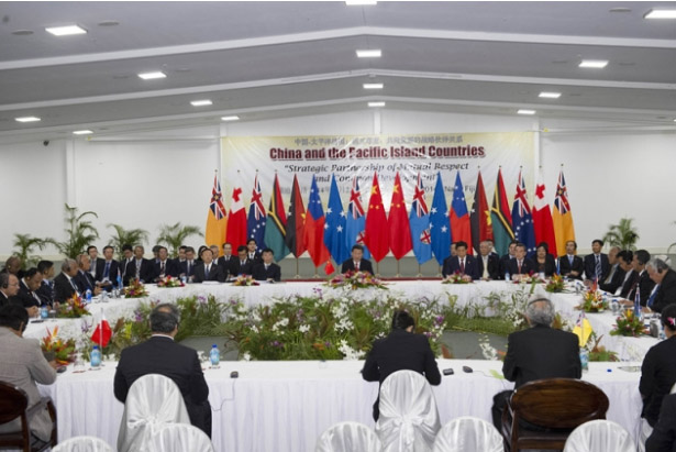 ????會議廳寬敞明亮,背景布上醒目地用中英文寫著“中國—太平洋島國:相互尊重、共同發(fā)展的戰(zhàn)略伙伴關系”。這一伙伴關系的確立,是習主席和8位島國領導人一致同意的重要成果。背景布前面擺著中國和8個太平洋島國的國旗,很是好看。整個會議廳,被布置得喜氣洋洋。