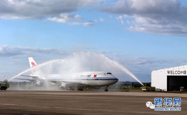 ???? ?11月21日,國家主席習近平抵達楠迪,開始對斐濟進行國事訪問并將同太平洋建交島國領導人舉行會晤。圖為習近平乘坐的專機在楠迪國際機場跑道上滑行穿過“水門”,這是當?shù)亟o予最尊貴客人的禮遇,表達為客人“洗塵”。 新華社記者 丁林 攝