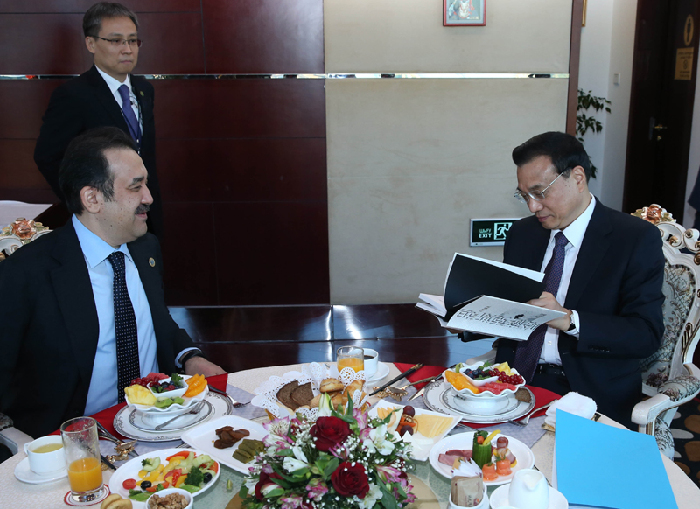 李克強(qiáng)與哈薩克斯坦總理馬西莫夫共進(jìn)早餐。新華社 龐興雷 攝