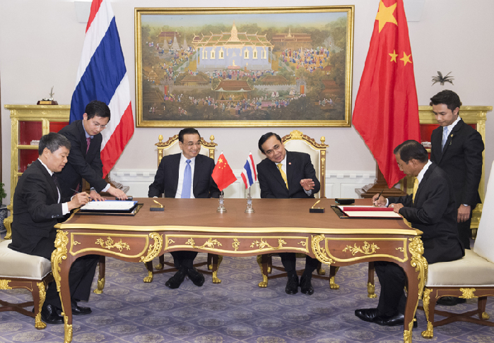 李克強(qiáng)與泰國總理巴育共同見證中泰鐵路合作備忘錄簽署。新華社 黃敬文 攝