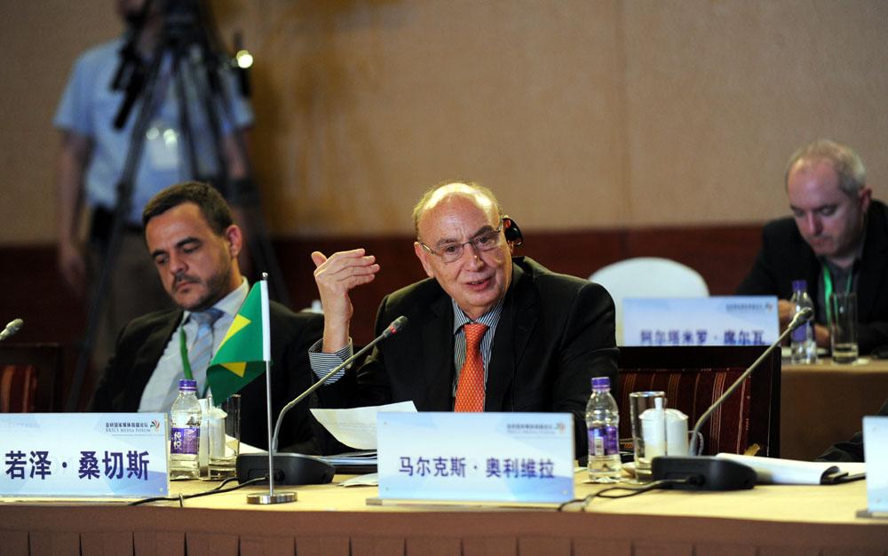 金磚國(guó)家媒體高端論壇開(kāi)幕式6月8日在北京舉行。圖為論壇共同主席、巴西金融資訊集團(tuán)總裁若澤·桑切斯發(fā)表講話。 新華網(wǎng) 孫韜 攝