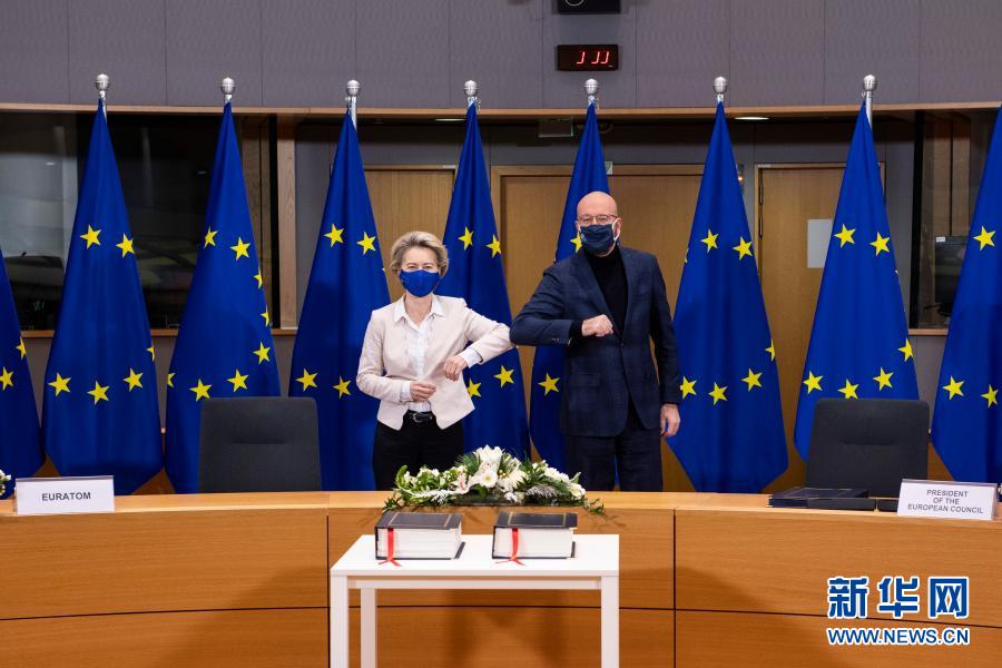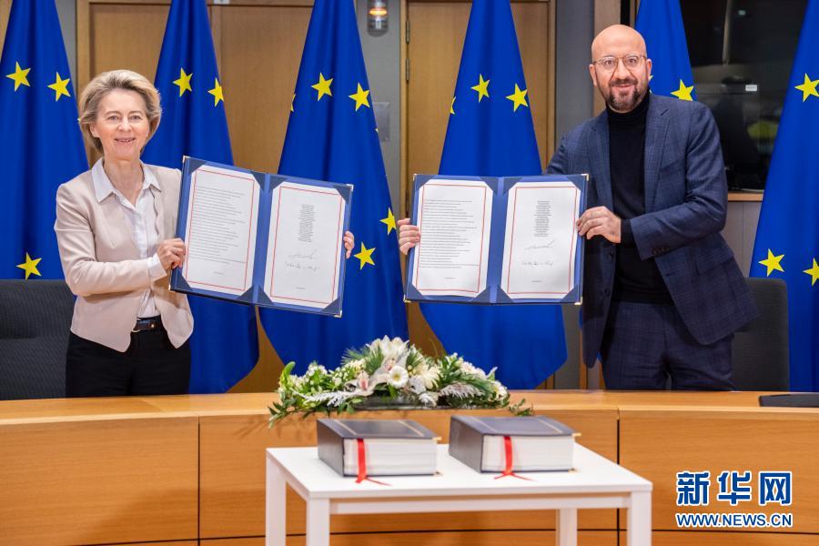 12月30日,在比利時布魯塞爾的歐盟總部,歐洲理事會主席米歇爾(右)和歐盟委員會主席馮德萊恩(左)出席簽署儀式。新華社發(fā)(歐盟供圖)