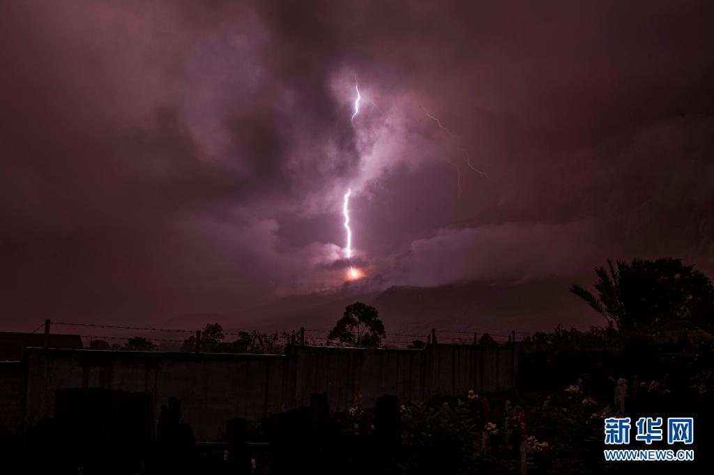 這是5月13日在印度尼西亞北蘇門答臘省拍攝的錫納朋火山上空的閃電(長時間曝光照片)。